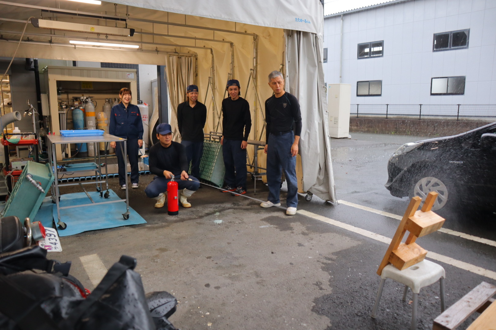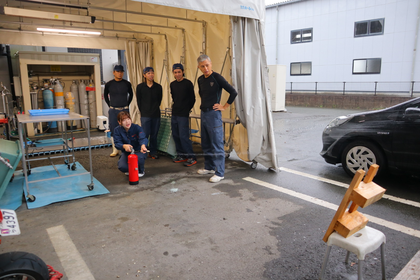 チームの「見守り」が心の支えに: 写真のように、周りの社員が見守る中で行う訓練は、適度なプレッシャーを与え、本番に近い緊張感を生みます。また、見ている側も、消火器の使い方を脳内でシミュレーションすることで、知識を定着させることができました
